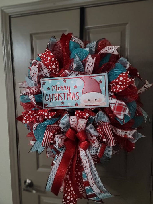 Christmas wreath, Red and Turquoise Christmas wreath, Santa Wreath, Door decor, Front door wreath