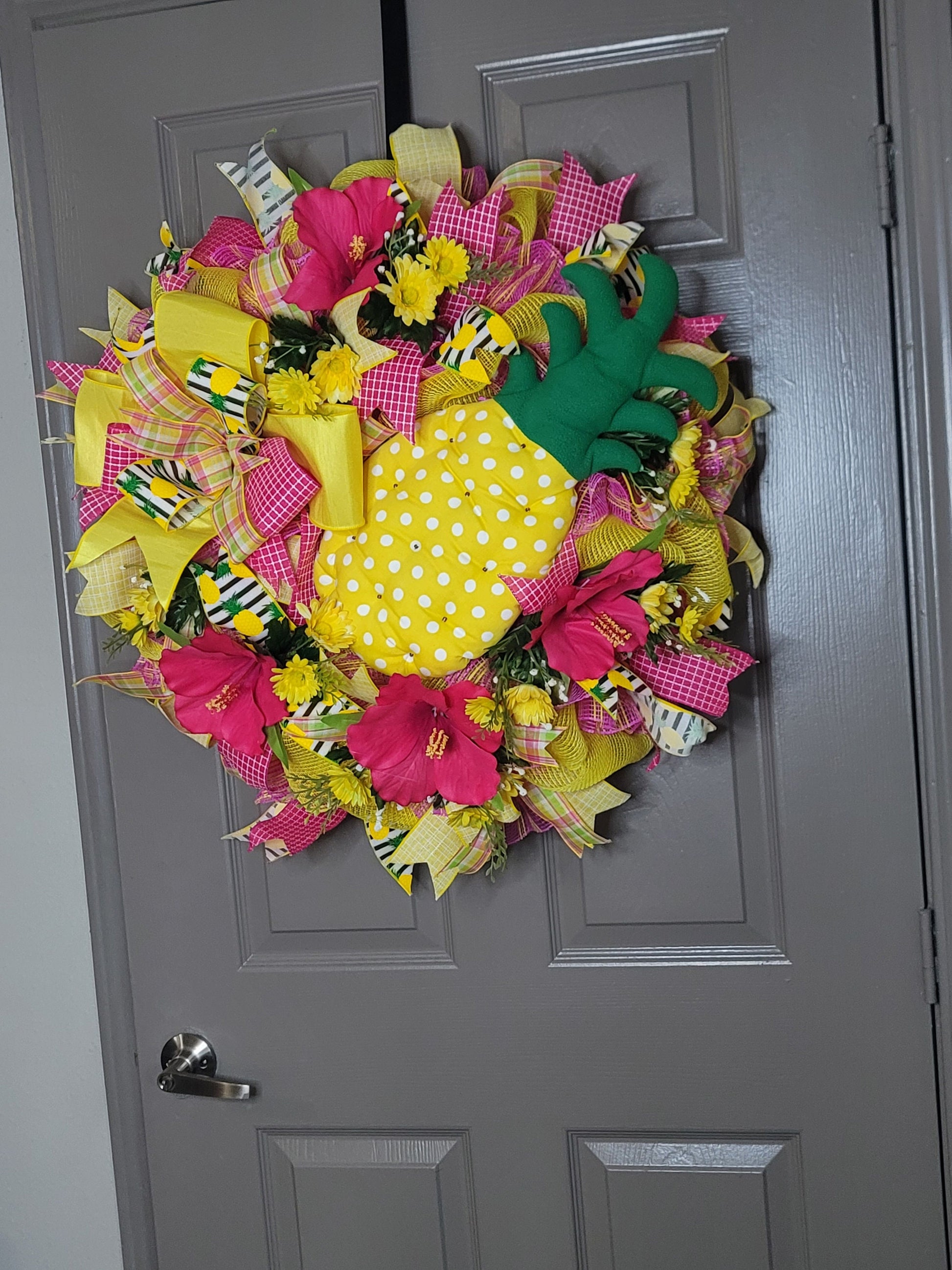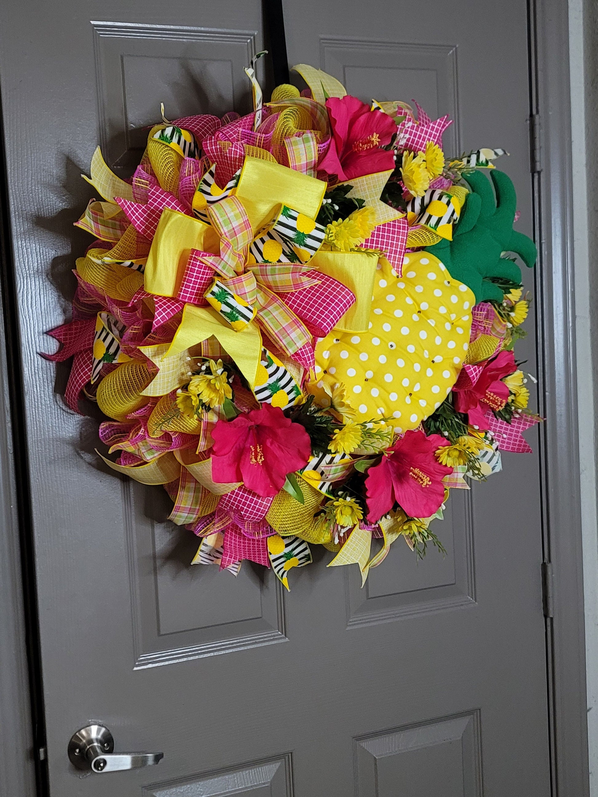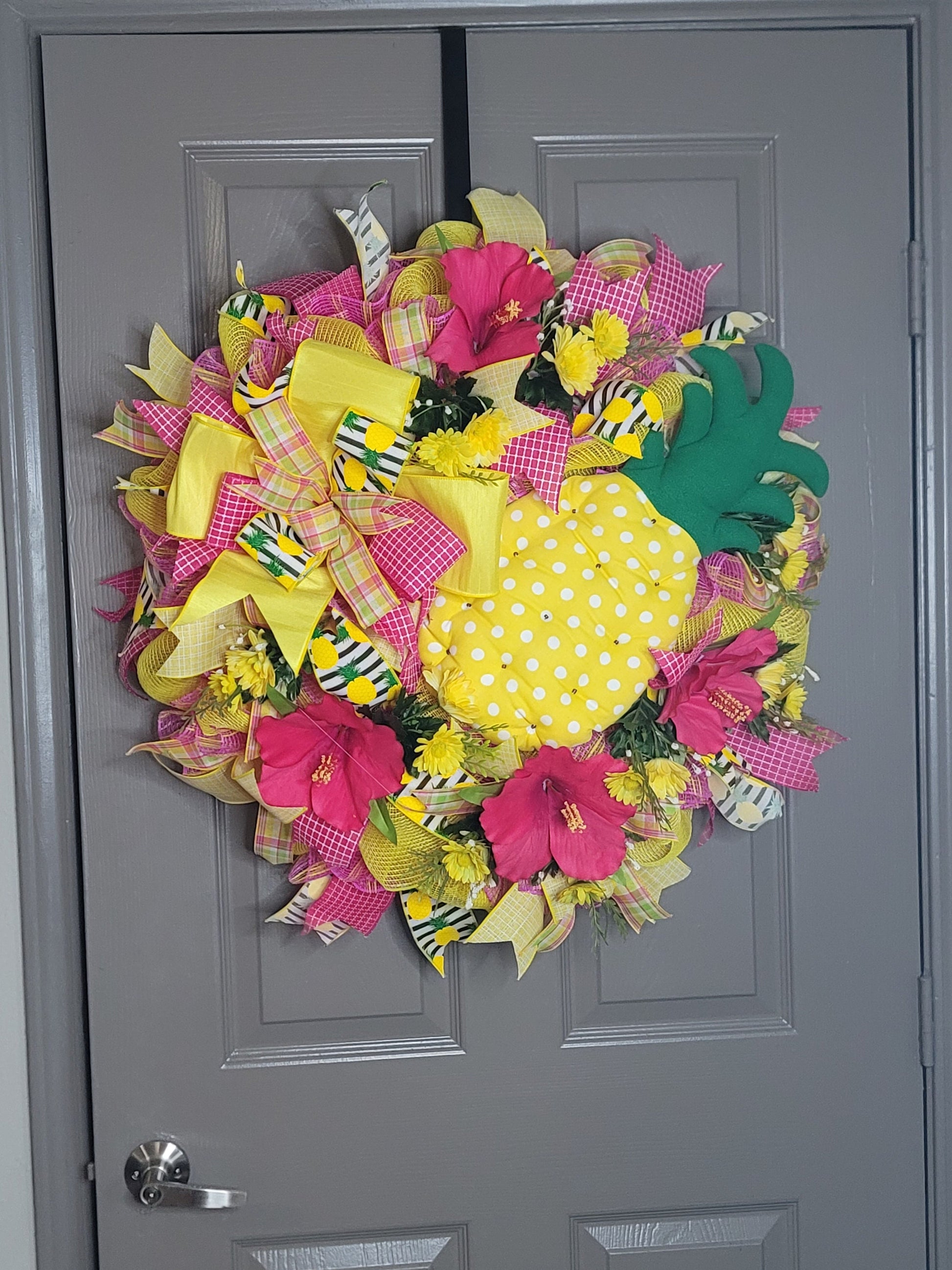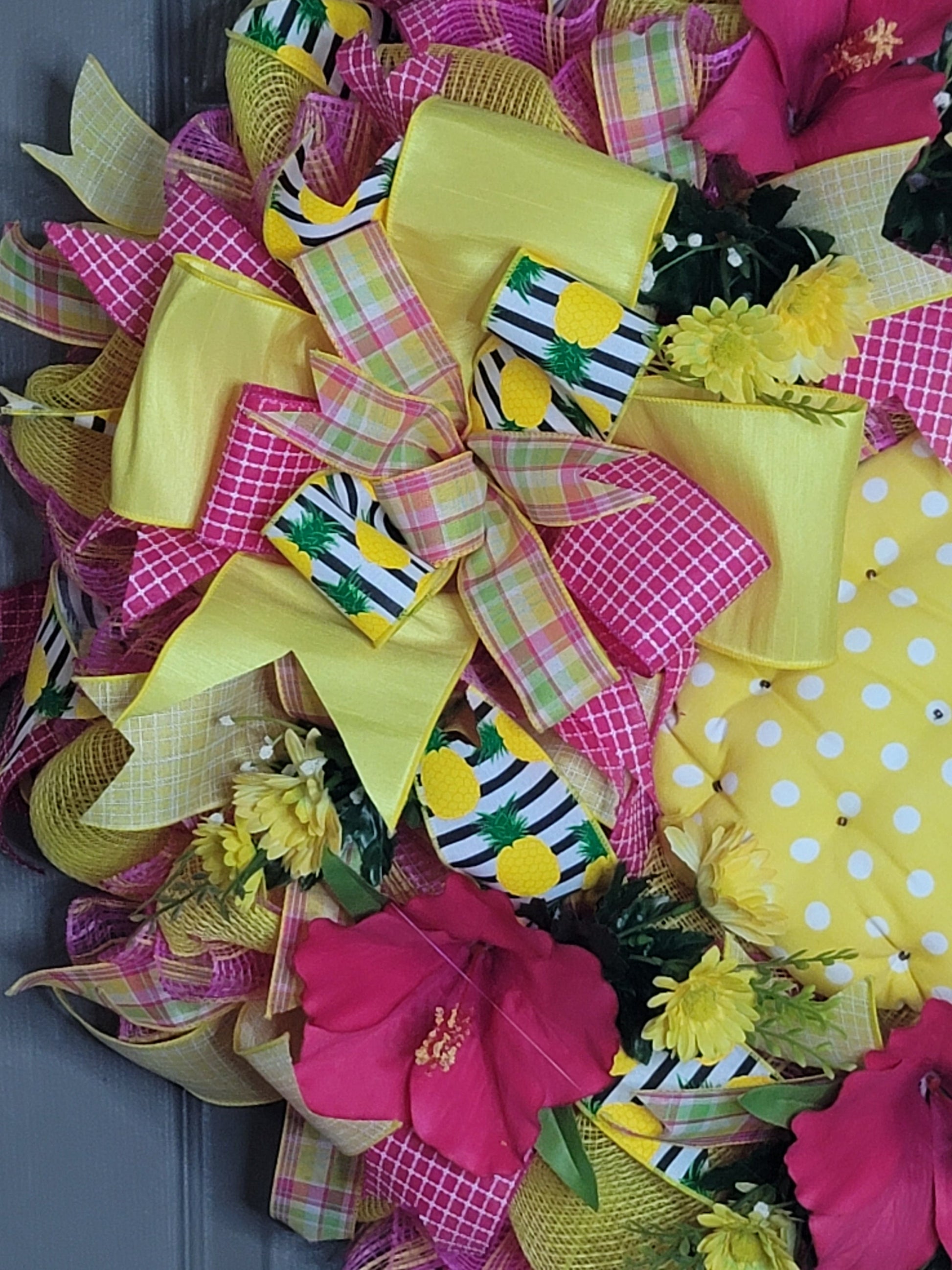 Bright Summer wreath, Pineapple wreath, pink hibiscus, yellow and hot pink