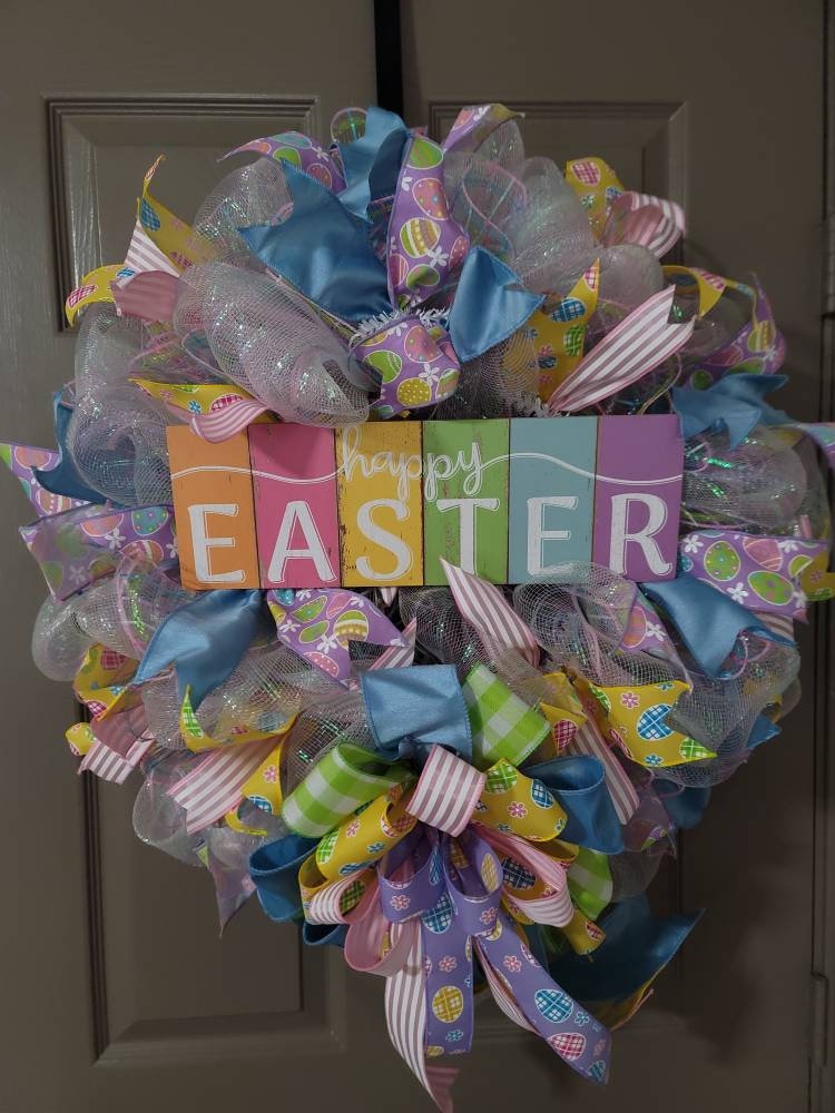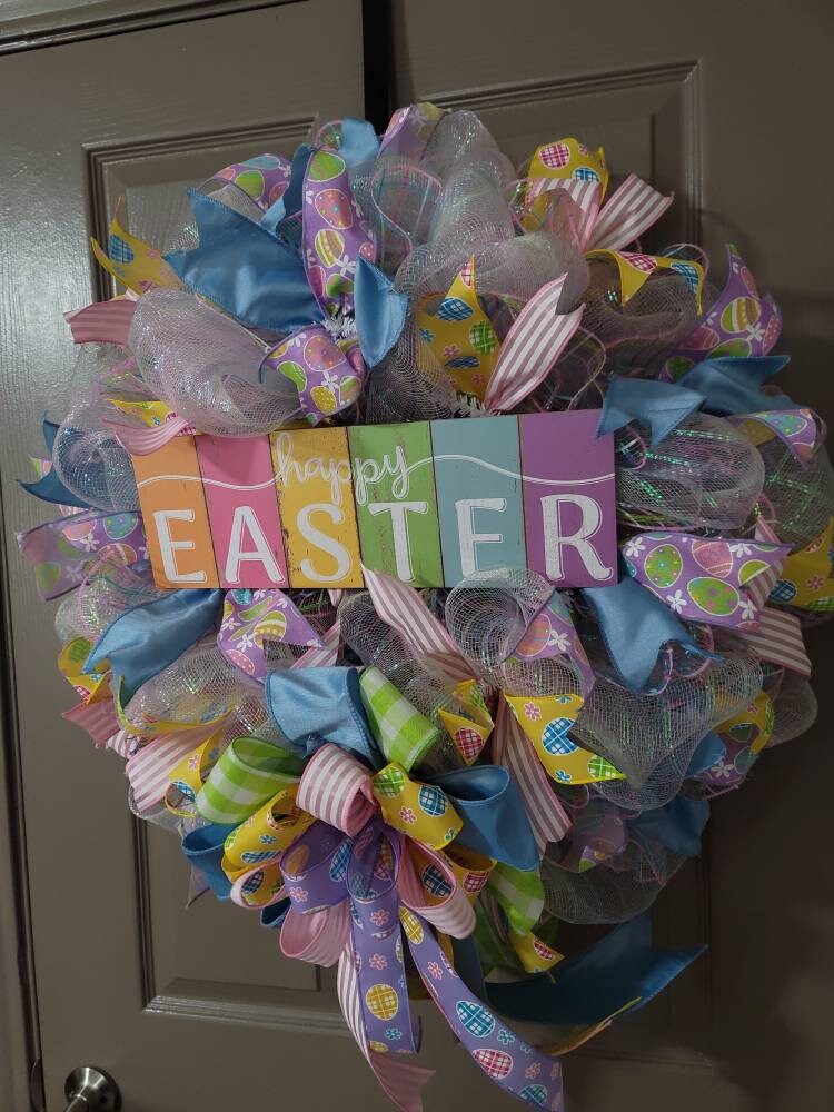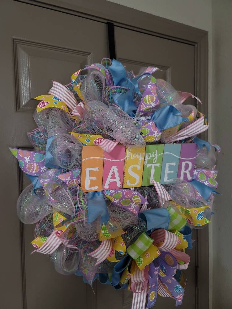 Expertly crafted with deco mesh and ribbon, this Easter wreath is perfect for the Easter season, measuring 26 inches in diameter and 8 inches wide. Add a festive touch to your front door or any room with this versatile and stylish wreath.