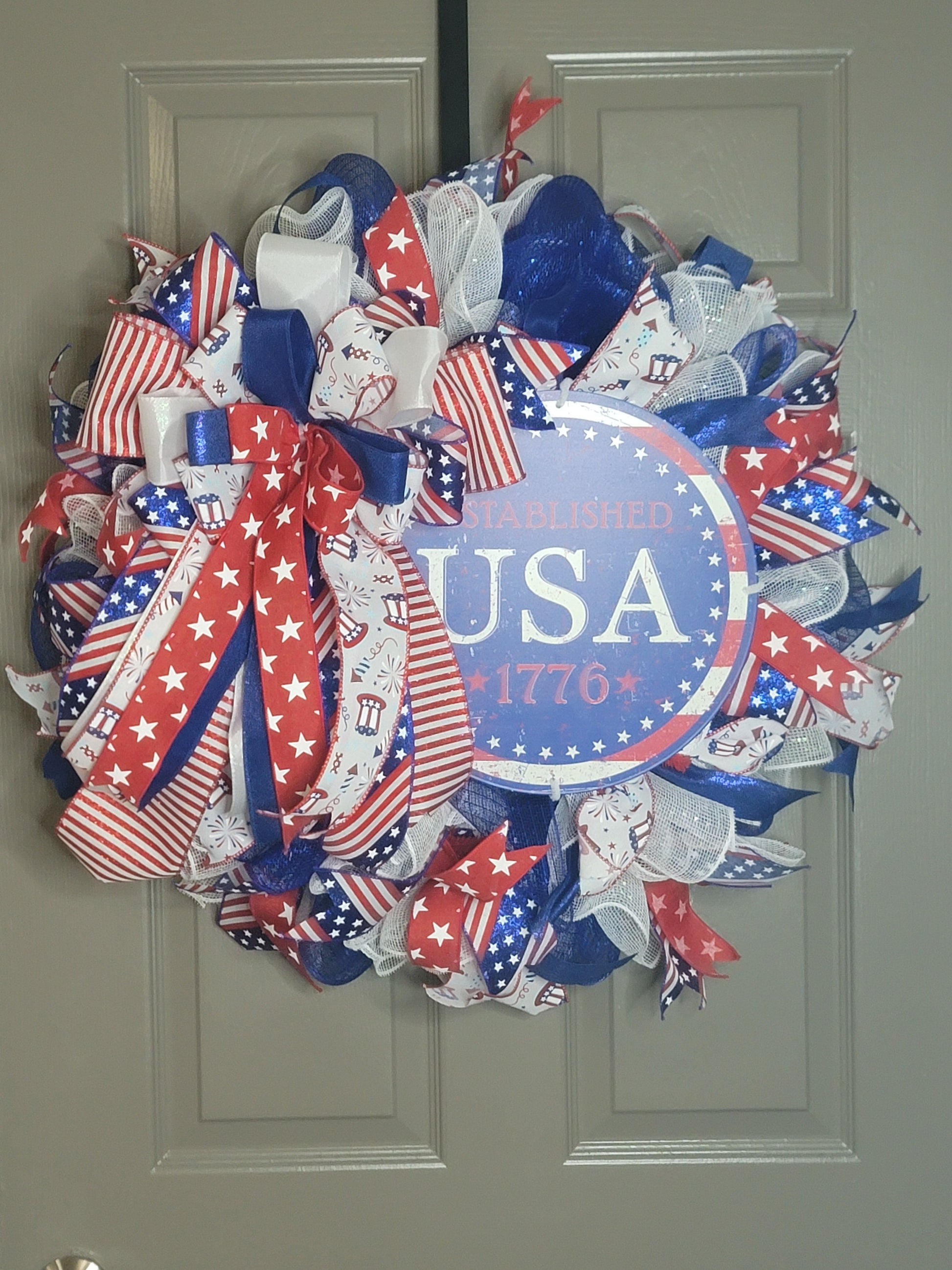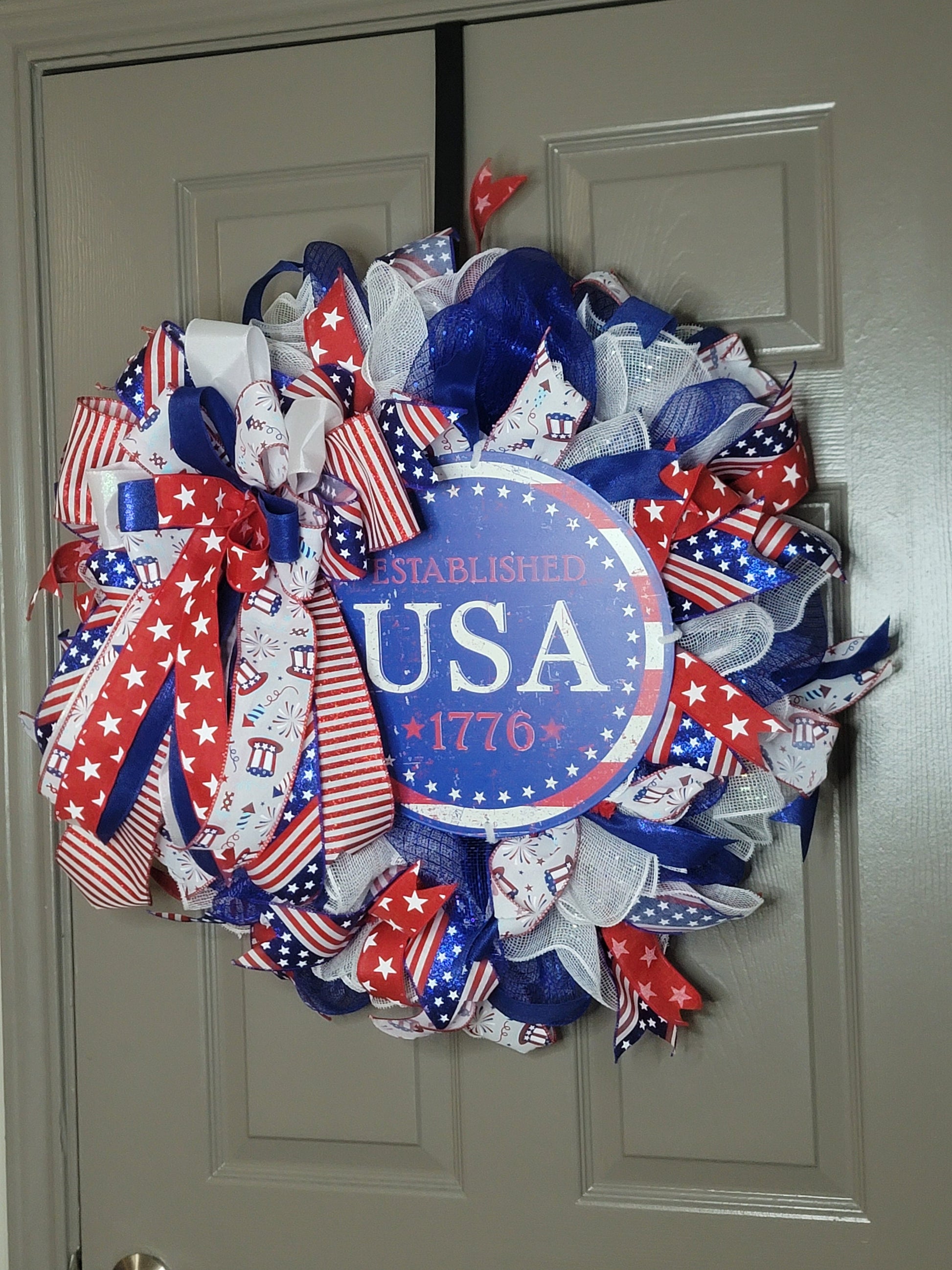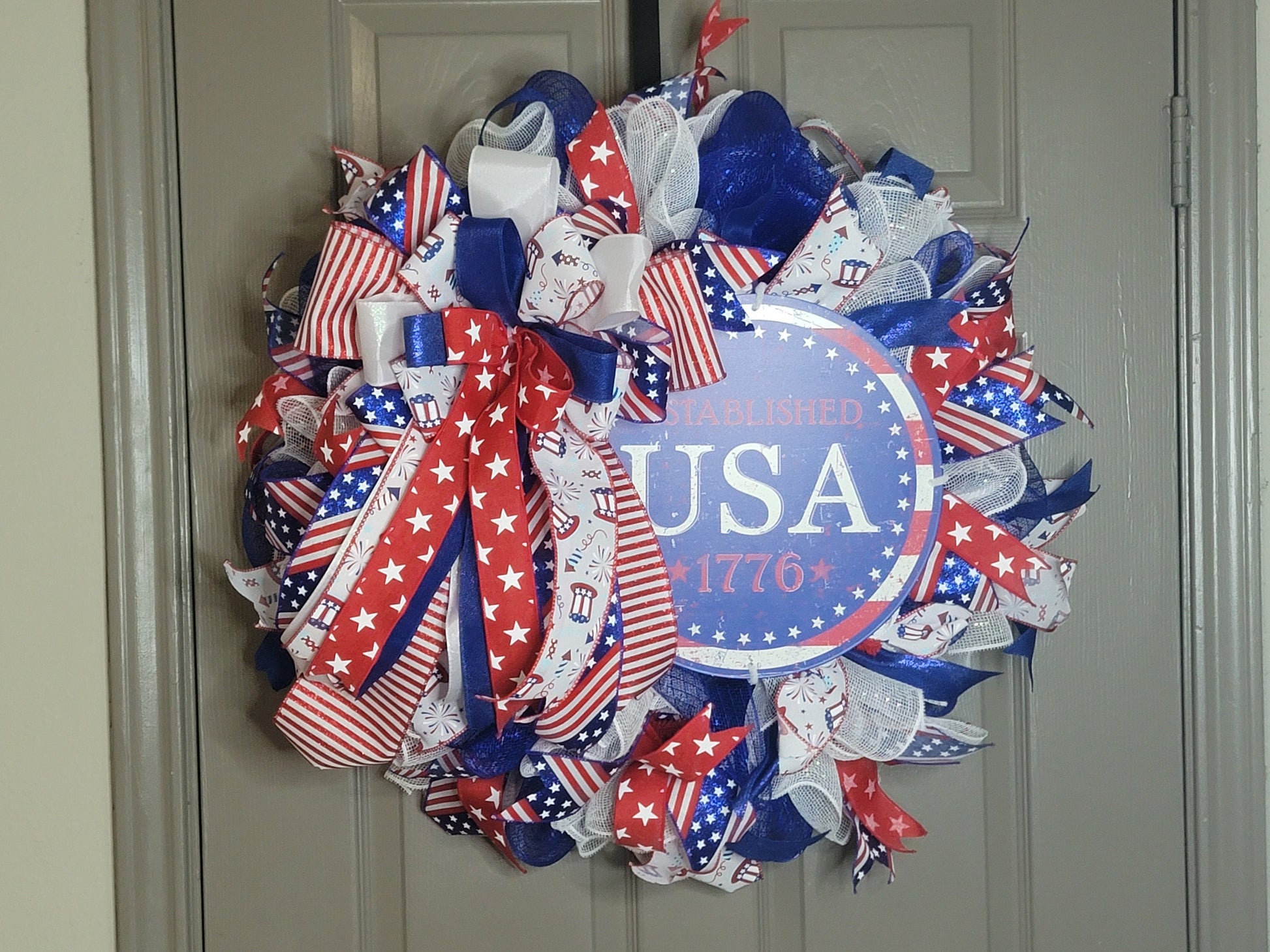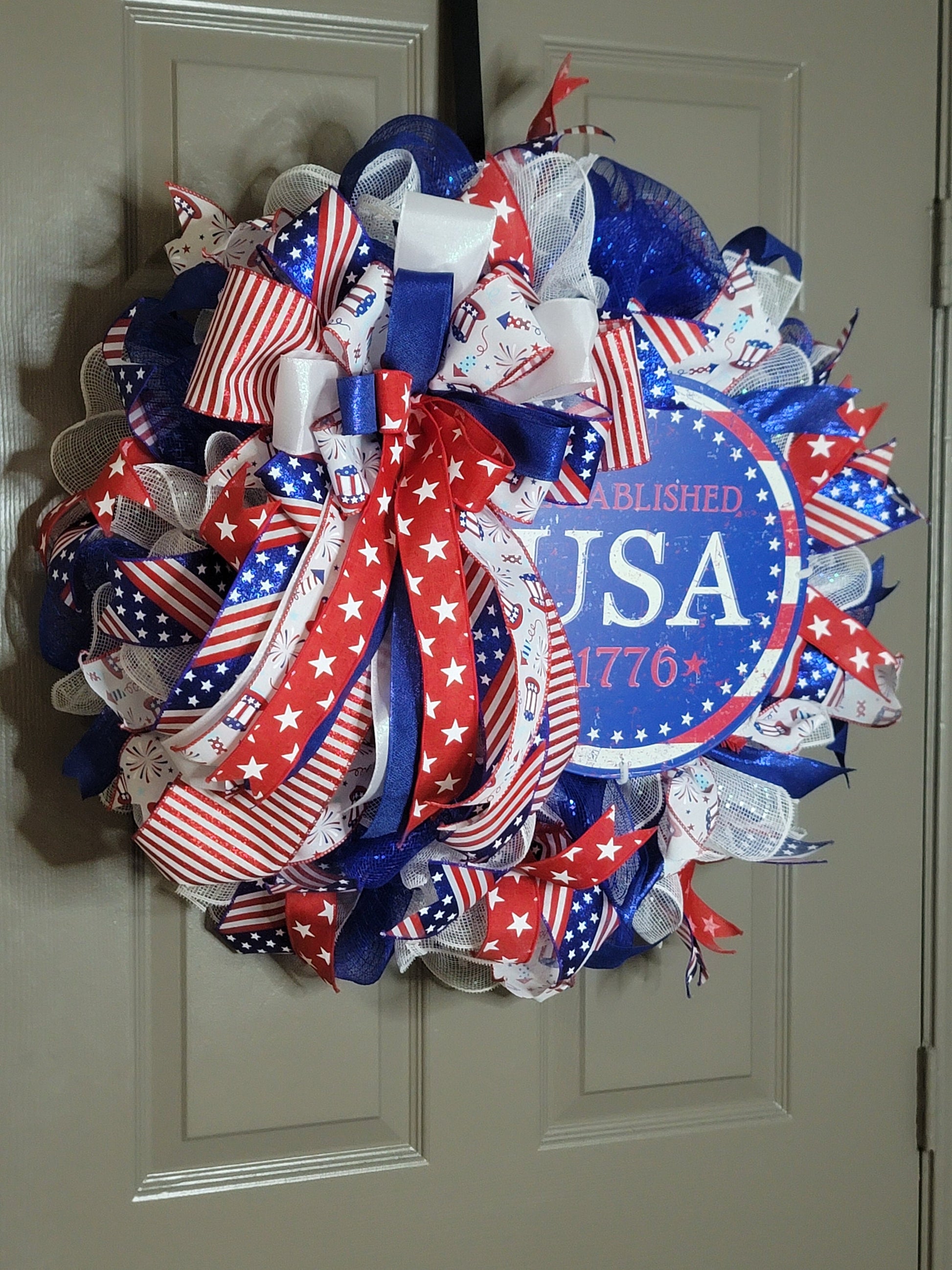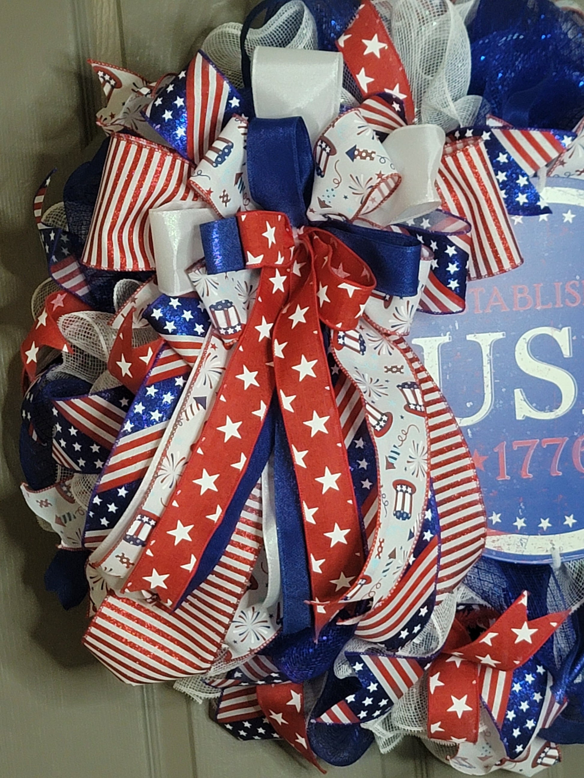 Introducing our versatile and patriotic wreath, perfect for Fourth of July, Memorial day, Labor day, or a summer celebration. Measuring 24 inches in diameter and 6 inches in depth, this wreath is sure to make a statement wherever you display it. Celebrate in style with our Red, White, and Blue wreath!