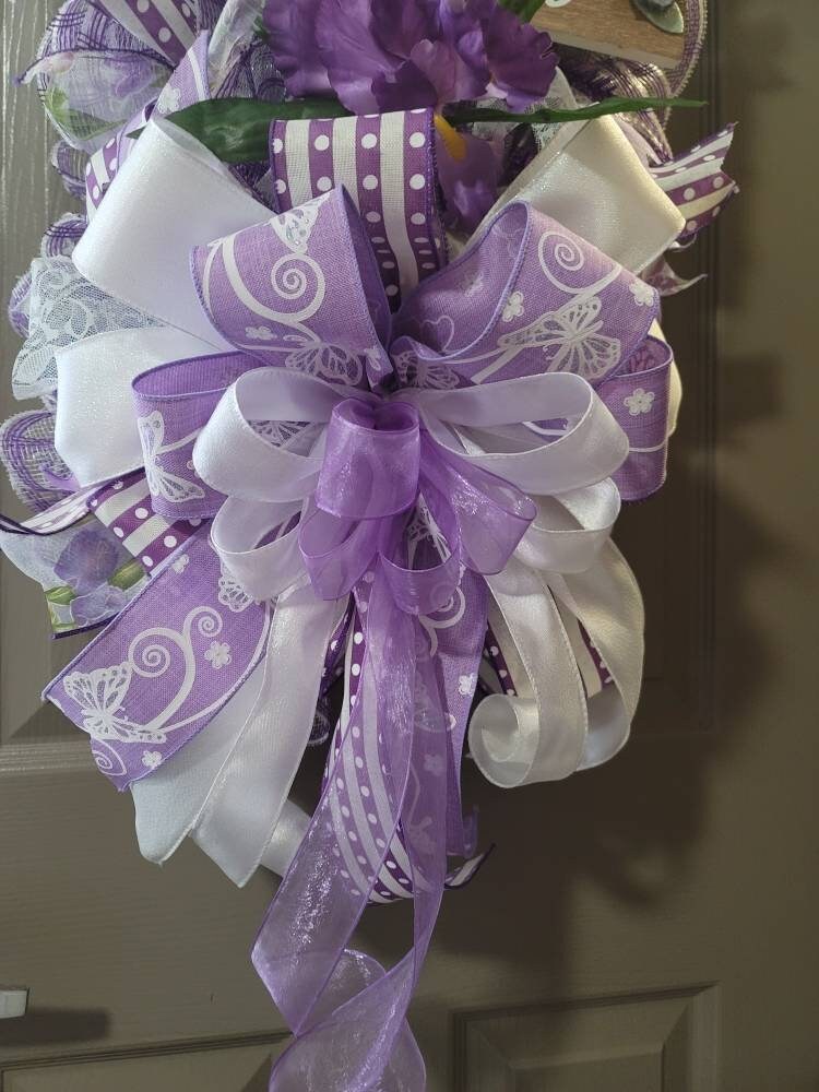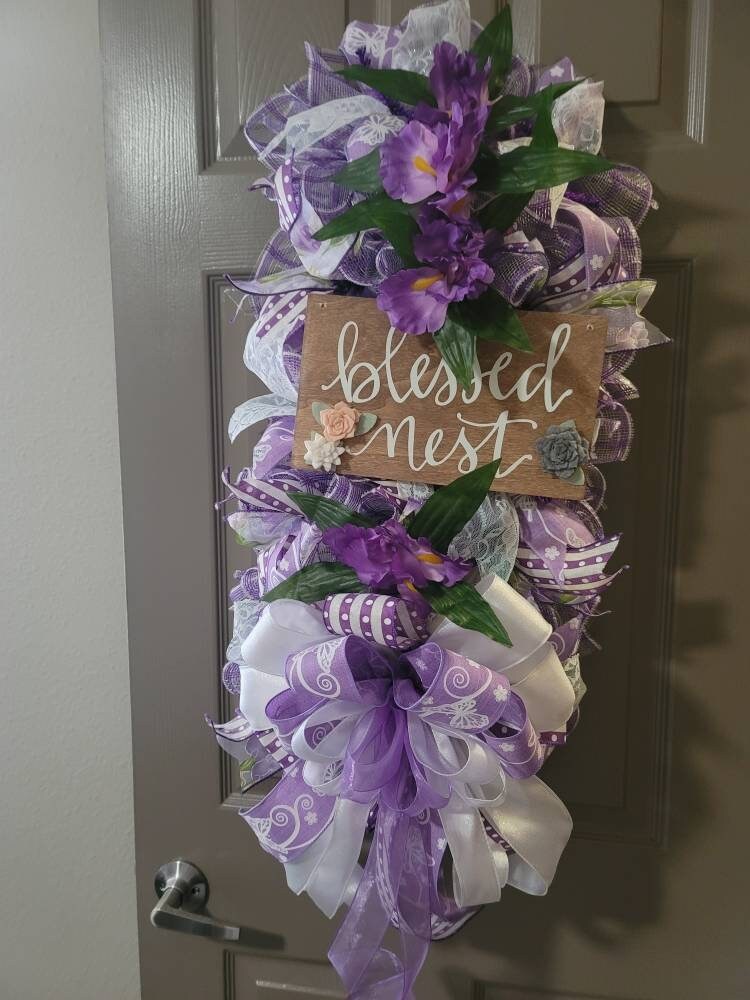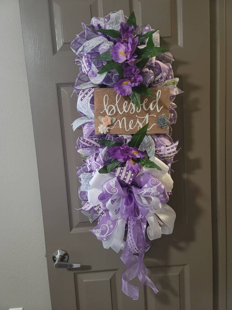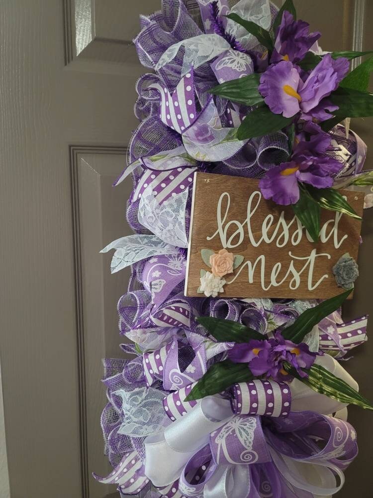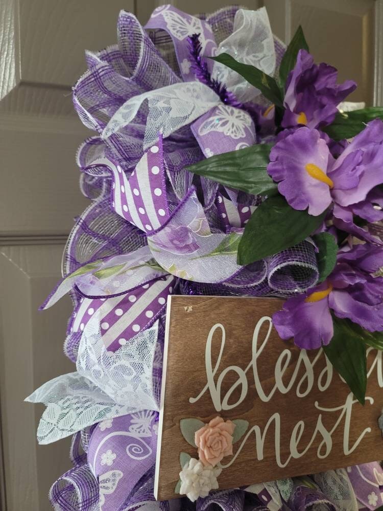 "This versatile "Blessed Nest" wreath in lavender and purple is a must-have for spring! Use as a door hanger, table centerpiece, or mailbox swag. Measures 30 inches long and 8 inches wide, made with deco mesh, wired ribbon, and floral accents. Perfect for adding a touch of seasonal charm to any space!"