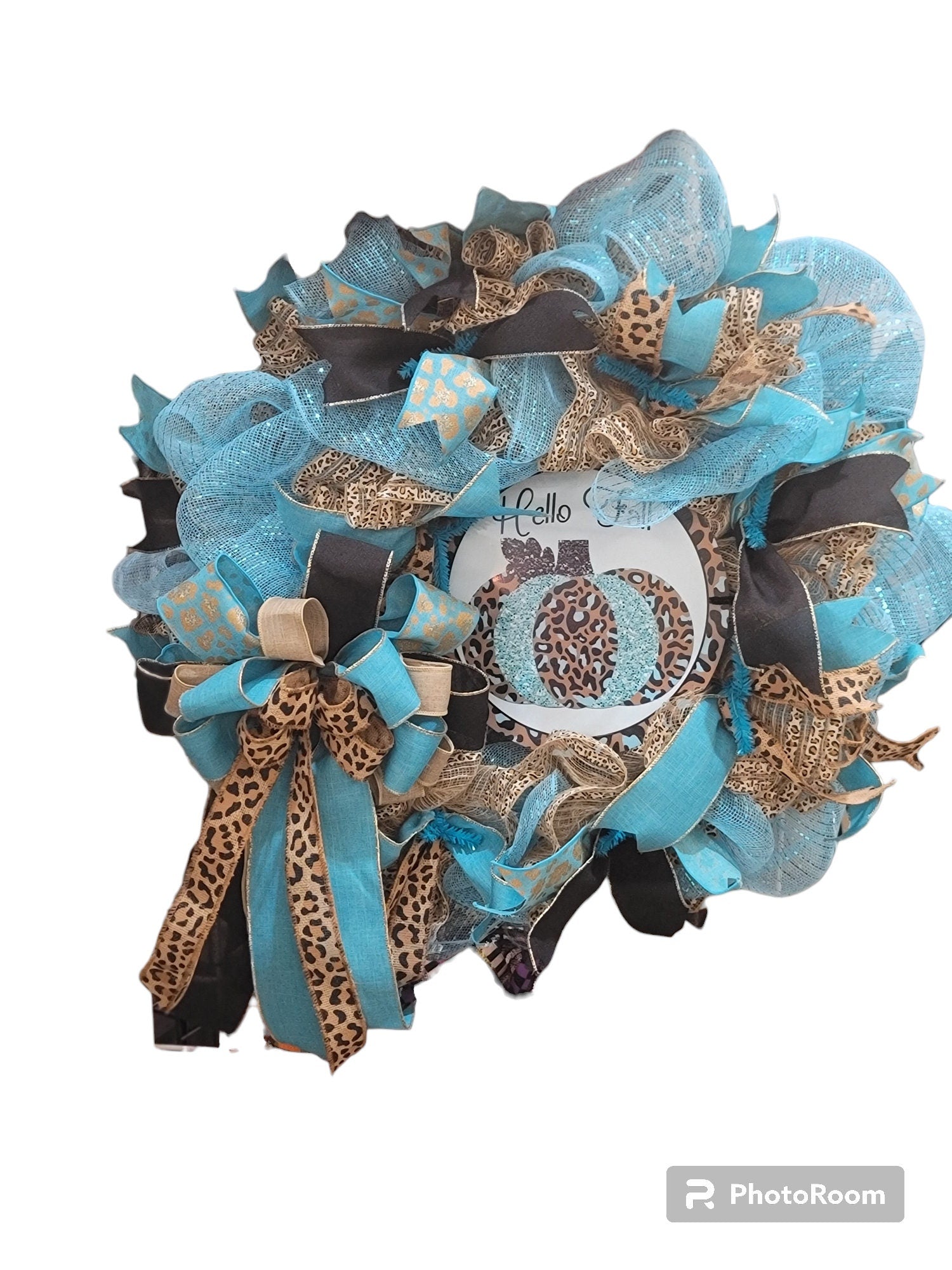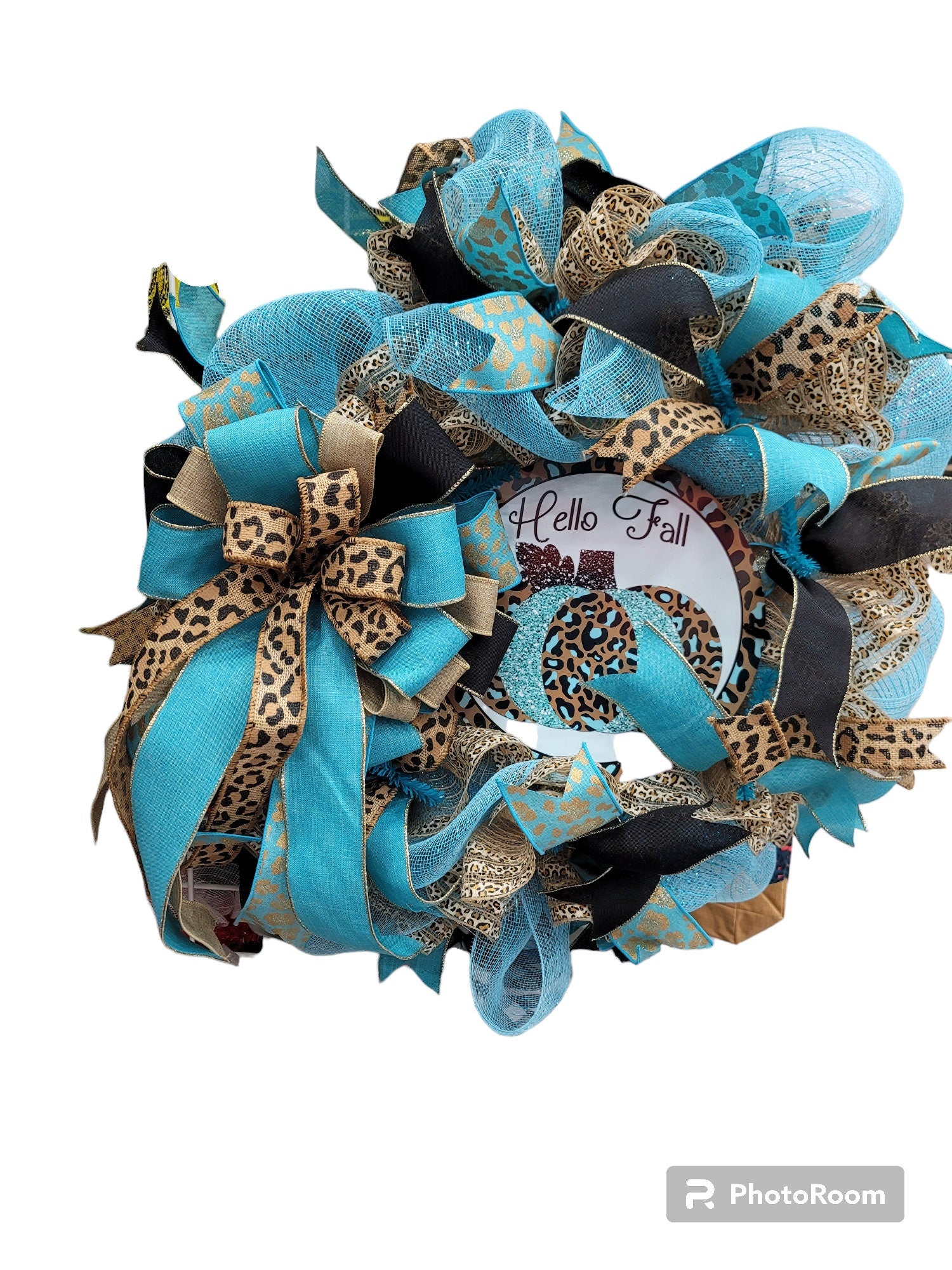 Turquoise and leopard print wreath, Fall wreath, home decor, door decor