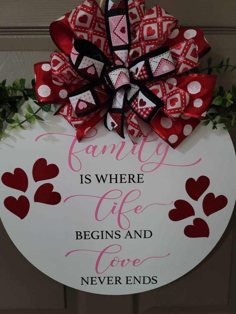Expertly crafted Valentine's or everyday door hanger for your home decor needs. Measuring 18 inches in diameter and 1 inch in width, this wood door hanger is the perfect addition to your door decor. Embrace the warmth and charm it brings to any entrance.