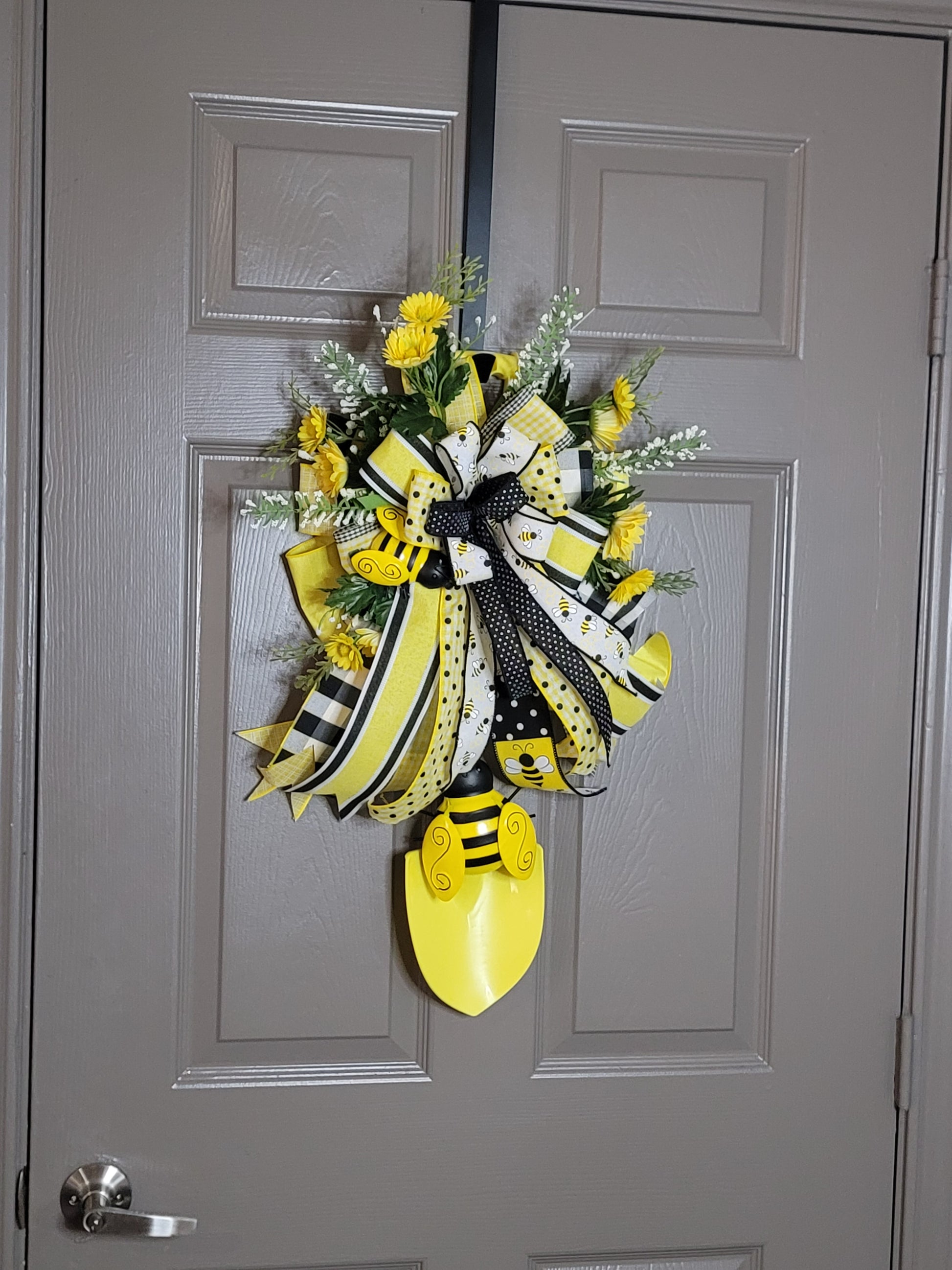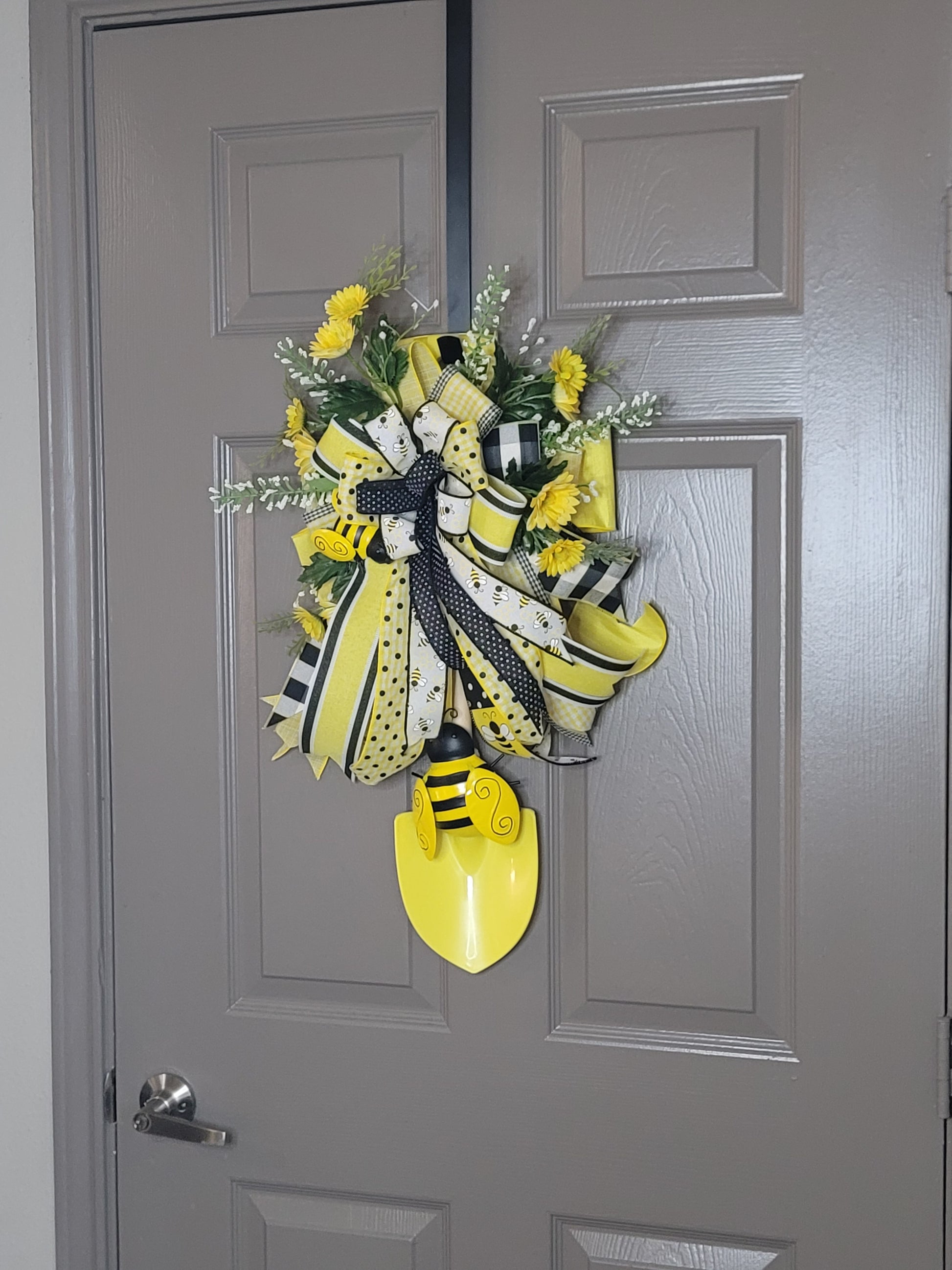Get ready to add a pop of color to your door with the Yellow Bumblebee shovel door hanger! With its 26-inch length and 14-inch width, this vibrant hanger not only looks great but also serves as a durable and functional addition to your home. Don't miss out on this unique and practical door accessory.